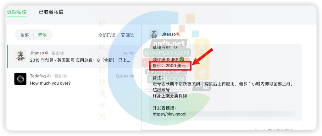 这帮N道贩子两头吃,一头通过Google Play 前台公开的开发者联系方式,进行批量发送求购信息,一方面寻找长老这样的渠道,企图轻松分销自己倒来的“老号”,真的是“聪明”,老外的智商完全不低,真的不低。
