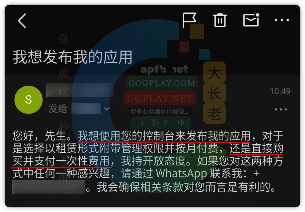 下面邮件截图为长老客户供图,为翻译中文后的截图,老外通过Google Play前台的开发者联系方式,想要租用或购买对方的开发者账号,这个开发者账号还是小编今年协助上架的。