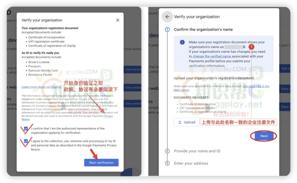点击【开始】进入身份验证流程,本流程仅限于公司类型的谷歌开发者,不适用于个人开发者。